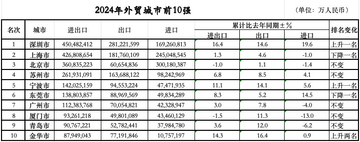 第一财经梳理海关总署的数据,2024年全国外贸前10强城市别离为:深圳、上海、姑苏、宁波、东莞、金华、广州、、杭州和青岛。比宁波更猛的是正在2023年排名第二的深圳,除了时隔9年后沉返内地外贸城市首位,深圳本身也实现了更多冲破2024年4。5万亿元的进出口规模为初次冲破4万亿,16。4%的同比增速别离较全国、广东省快11。4个、6。6个百分点。进口、出口也均为汗青新高,此中,出口2。81万亿元,增加14。6%,实现32连冠;进口1。69万亿元,增加19。6%。2024年全年8838万份报关单中的最初一张,记实的恰是深圳一家平易近营企业的出口消息。这张报关单为2024年中国外贸进出口画上了一个句号。也恰是正在这一年,深圳平易近营企业的外贸规模占比初次冲破7成。2024年,深圳平易近营企业有进出话柄绩企业数量近4。7万家,企业数量占比近9成,合计进出口3。16万亿元,增加24。2%,快于深圳市全体7。8个百分点,占同期总值的70。1%,比沉较2023年提拔4。4个百分点,成为拉动深圳外贸增加的次要动力。宁波的平易近营企业数量占比更是跨越了9成,外贸规模则接近8成。数据显示,2024年,宁波的平易近营企业数量已添加至近2。7万家,占同期宁波市外贸企业总数的90。9%,此中,外贸规模超亿元平易近营企业数量添加至1690家。同期,宁波平易近营企业进出口1。09万亿元,增加13%,占全市进出口总值的76。6%。进出口总值从第六名升至第五名之外,宁波的出口规模正在全国城市中排名第四,仅次于深圳、上海和姑苏。另一座正在2024年较着上升的城市是坐拥“世界小商品之都”义乌的金华。从2023年的第12位跻身全国前10强的跃升,也让金华初次超越杭州,位居浙江省第二。浙江金华海关的动静称,2024年金华外贸规模再立异高,共实现外贸进出口总值8794。9亿元,同比增加14。3%,增速居浙江省首位。出口做为其强项,客岁金华出口达7719。2亿元,同比增加16。4%,占浙江省的份额为19。8%,创下汗青新高。金华的进出口近8成由义乌贡献,而义乌的平易近营经济占领了90%以上的市场从体、实现了90%以上的P。2024年前11个月,浙江省义乌市进出口总值就冲破了6000亿元,同比增加17。6%。此中出口5420。6亿元,同比增加17。4%;进口719。3亿元,同比增加19。0%,进出口、出口和进口值占全省份额别离为12。8%、15。2%和5。8%,占比别离提拔1。2、1。1和0。9个百分点。面临全球订单的碎片化趋向,市场采购模式对本地甚至周边的出口具有较着的拉动感化。2024年前11个月,义乌市通过市场采购商业体例出口4350。2亿元,同比增加21。7%,占义乌市出口总值的80。3%,拉动义乌市出口增加16。8个百分点。另据浙江中国小商品城集团股份无限公司数据,2024年,义乌中国小商品市场日均人流22。43万人次,此中日均外商超3900人,创10年新高。除了正在外贸前10强中实现了跃升的城市案例,从全国层面看,平易近营企业的贡献也正在持续提高。2024年,我国平易近营企业进出口24。33万亿元,增加8。8%,占全国外贸总值的比沉提拔至55。5%,继续成为外贸第一大运营从体。的数据还显示,2024年的平易近企进出话柄现了三个“初次”,别离是有进出话柄绩的平易近营企业数量初次跨越60万家,达到60。9万家;平易近营企业初次成为我国高手艺产物的最猛进出口从体;平易近营企业占我国消费品进口比沉初次跨越50%,同比提拔2。8个百分点至51。3%,此中正在日化用品、生果等产物中比沉跨越六成。