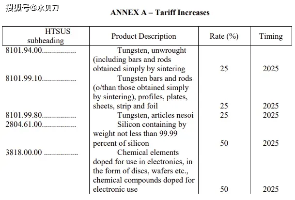 2024年12月11日,美国商业代表办公室发布声明称,颠末拜登为期四年的审查,美国将从来岁岁首年月起头提高对自中国进口的太阳能硅片、多晶硅和部门钨产物的进口关税。硅片和多晶硅的关税税率将提高到50%,部门钨产物的关税税率将提高到25%。这些关税上调办法将于2025年1月1日生效。