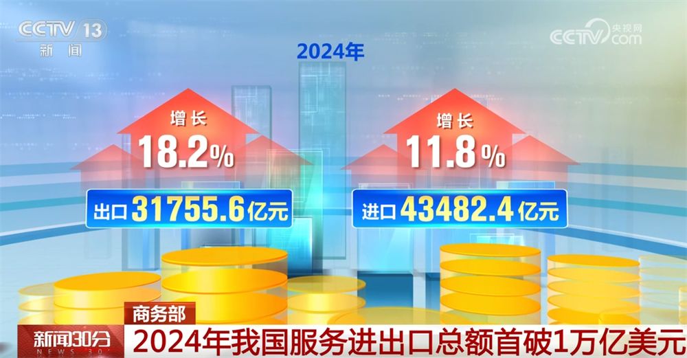 商务部数据显示,2024年,我国办事商业实现快速增加,全年办事进出口总额初次冲破1万亿美元,规模创下汗青新高,布局持续优化,展示出广漠的成长潜力。2024年,中国全年办事进出口总额75238亿元,同比增加14。4%。此中,出口31755。6亿元,增加18。2%;进口43482。4亿元,增加11。8%;办事商业逆差11726。8亿元,比上年削减314。3亿元。