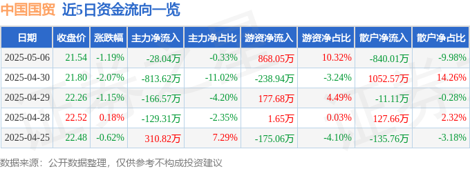 证券之星动静,截至2025年5月6日收盘,中国国贸(600007)报收于21。54元,下跌1。19%,换手率0。39%,成交量3。9万手,成交额8413。71万元。5月6日的资金流向数据方面,从力资金净流出28。04万元,占总成交额0。33%,逛资资金净流入868。05万元,散户资金净流出840。01万元,占总成交额9。98%。